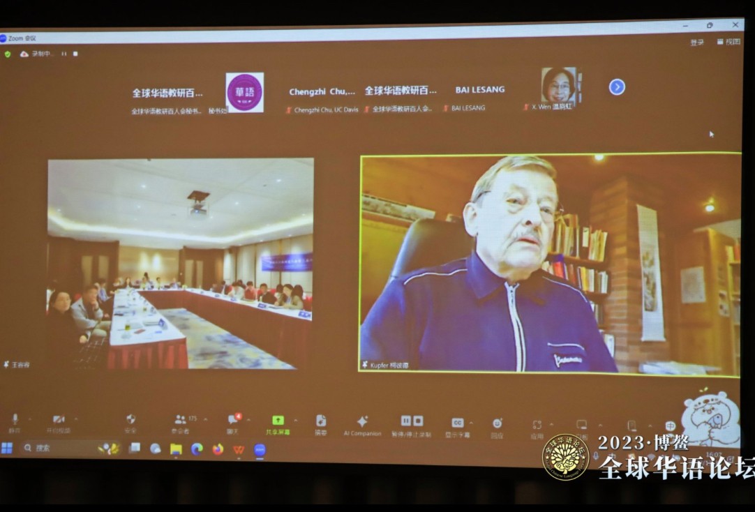 12月31日上午为论文报告、百人会联谊座谈以及百人会会员大会。论文报告环节由何宝璋教授、信世昌教授主持,白建华教授发表了《主题式有效互动模式在国际中文教学中的应用》,砂冈和子教授发表了《日本汉语课堂中的语码转换与隐性管理策略:人工智能与学生听力表现比较》,曾金金教授发表了《由唐宋诗词到汉德双向外语教学跨越千年的国际汉语发展——专访德国吕福克博士》,郭岚教授发表了《会说话的树。树说/述说:疫情期间和后疫情时代的虚拟东方之旅》,杜争鸣教授发表了《汉语动态特征及其在高等汉语教学中的地位——以两首歌曲汉英对比为个案》,冯海霞老师发表了《汉日喻人词语对比及其在汉语学习词典中的应用》,冯冬梅老师发表了《缅甸华文教师华语传承信念研究》,李连伟老师发表了《新形势下国际中文教育语用信息研究及信息库建设探索》,徐艳华老师发表了《职场汉语教材研究——以<国际职场通用汉语>为例》,曹方向老师发表了《汉字教学》。